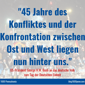 Der Tag der Deutschen Einheit jährt sich in diesem Jahr bereits zum 28. mal. Ohne die Unterstützung der Vereinigten Staaten von Amerika hätte es den Einigungsprozess wohl kaum so gegeben. „1600 Pennsylvania“ nimmt dies zum Anlass, euch die Rede des damaligen US-Präsidenten George H.W. Bush an das deutsche Volk vom 02. Oktober 1990 zum nachlesen bereitzustellen: