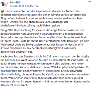 Ebenso sah Polis 180 im Duell zwischen Senator Ted Cruz und Beto O’Rourke ein „key race“. In der Tat wurde dieses Duell zwischen dem erzkonservativen Republikaner und seinem progressiven Herausforderer medial aufgeladen. Eng war das Rennen jedoch nie. Senator Cruz führte in Umfragen konstant mit fünf bis sieben Prozentpunkten.