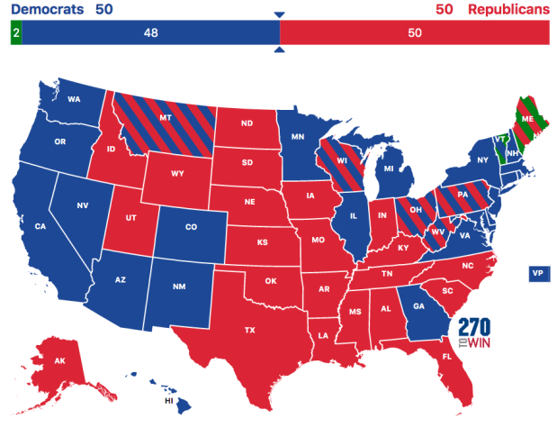 In diesem Jahr stehen explizit 35 Senatssitze zur Wahl. Während Republikaner 21 Sitze verteidigen müssen, ist dies bei Demokraten nur bei 14 Sitzen der Fall. Sechs U.S. Senatoren treten nicht zur Wiederwahl an, davon gehören Fünf der Republikanischen Partei an. Die Wahlmathematik favorisiert also die Demokratische Partei.