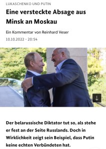 Lukashenko und Putin verbindet eine Hassliebe. Minsk steht mitnichten zu 100% hinter Moskau wie auch die FAZ in einem Kommentar treffend feststellte.