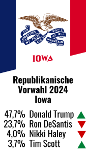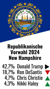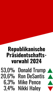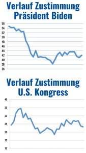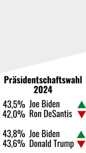 US-amerikanische Politik (Pfeil nach oben/unten: Wert ist zum Vormonat gestiegen/hat abgenommen). Quellen, falls nicht anders angegeben, sind die auf Real Clear Politics veröffentlichten Durchschnittswerte der wichtigsten Umfrageinstitute.
