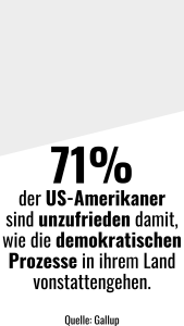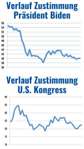 US-amerikanische Politik (Pfeil nach oben/unten: Wert ist zum Vormonat gestiegen/hat abgenommen). Quellen, falls nicht anders angegeben, sind die auf Real Clear Politics veröffentlichten Durchschnittswerte der wichtigsten Umfrageinstitute.