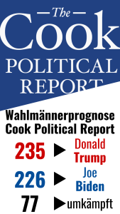 | Kandidat | Landesweite Umfrage (Stimmungsindikator) | Wahlmännerprognose* (270 für Wahlsieg nötig) |