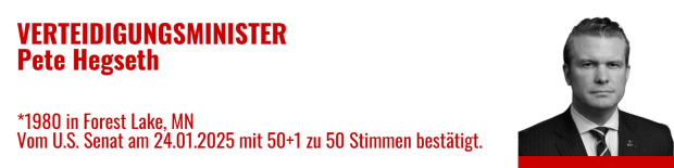 Die Skepsis gegenüber Hegseth, der zehn Jahre lang selbst in der U.S. Army sowie in der Nationalgarde, unter anderem auf Guantánamo, im Irak und in Afghanistan diente, legte sich dennoch nie. Schließlich gesellen sich neben der streitbaren Persönlichkeit auch fehlende administrative Erfahrungen von Seiten Hegseths. Letzteres wiegt umso schwerer, bringt die Position des Verteidigungsministers doch ein sehr hohes Verantwortungsbewusstsein mit sich. Schließlich zeichnet sich der Chef des Pentagon für 750.000 Zivilangestellte sowie 1,3 Millionen Soldaten und für ein Budget von $ 850 Milliarden verantwortlich.