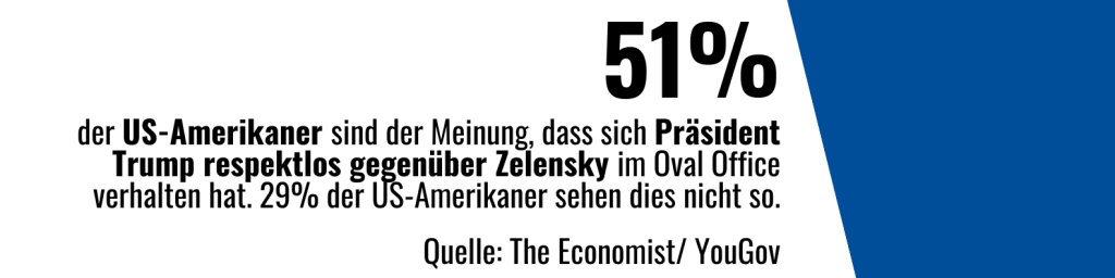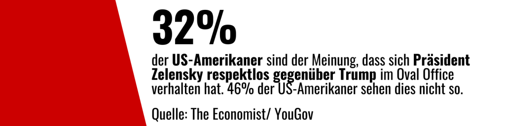 Denn Vizepräsident Vance ließ das Gespräch endgültig eskalieren, indem er behauptete, dass Zelensky nicht dankbar sei. Dabei dankt der ukrainische Präsident den USA und den US-Amerikanern unentwegt für die Unterstützung – so auch an diesem denkwürdigen Tag. Präsident Trump setzte daraufhin seine bekannte Desinformationskampagne gegen Zelensky und die Ukraine fort. Im Zangengriff wurde Zelensky von den US-Amerikanern regelrecht erniedrigt.