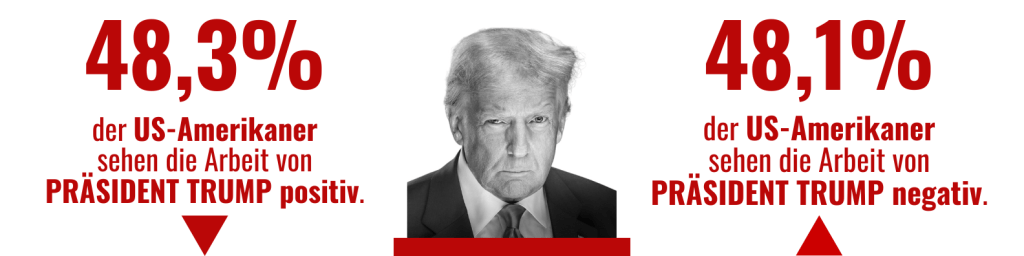 „1600 Pennsylvania“ informiert über die aktuellsten repräsentativen Umfragen rund um US-amerikanische Politik (Pfeil nach oben/unten: Wert ist zum Vormonat gestiegen/hat abgenommen). Quellen, falls nicht anders angegeben, sind die auf Real Clear Politics veröffentlichten Durchschnittswerte der wichtigsten Umfrageinstitute.