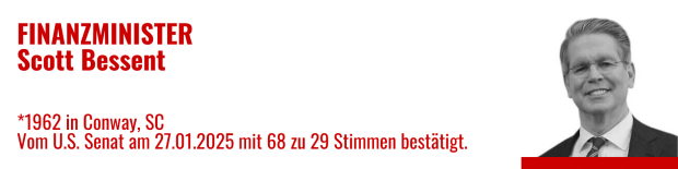 Neben der monetären Unterstützung äußerte sich Bessent im vergangenen Wahlkampf zudem unterstützend ob der von Trump geäußerten Zollpolitik. Importzölle sollten jedoch nicht allgemein ausgesprochen werden, sondern sich gezielt gegen die Volksrepublik China richten. Eine Position, die sich nach dem von Präsident Trump erklärten „Liberation Day“ vom 02.04.2025 auch zunächst durchsetzen sollte. Dabei hatte es der 79. US-Finanzminister mit einflussreichen Gegenspielern im Weißen Haus zu tun, die mit der Zollpolitik ganz andere Ziele, wie beispielsweise die Beendigung der Globalisierung, verfolgten, zu tun.