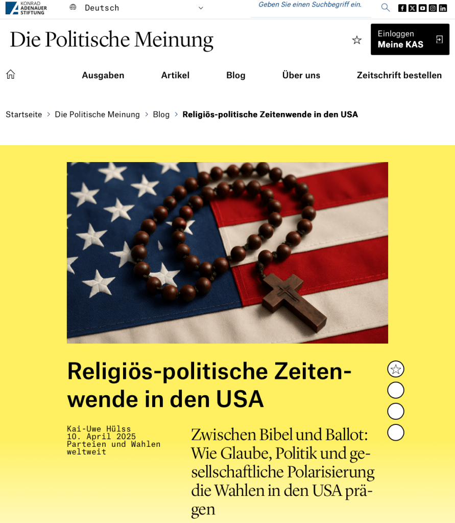Mit der Präsidentschaftswahl 2024 vollzog sich in den USA eine Wende in vielerlei Hinsicht. Im Weißen Haus ist der einfühlsame Katholizismus eines Joe Biden der alttestamentarischen Ellbogengesellschaft Donald Trumps gewichen. In einem ausführlichen Beitrag für „Die Politische Meinung“ der Konrad-Adenauer-Stiftung hat sich der Inhaber von „1600 Pennsylvania“ mit dieser Thematik auseinandergesetzt und dabei festgestellt, dass bislang einzig die Katholische Kirche und weitere Religionsgemeinschaften gegenüber der zweiten Amtszeit von Präsident Trump opponieren.