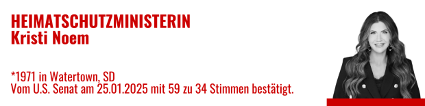 Seit ihrer Gründung hat das US-Heimatschutzministerium acht verschiedene Minister gesehen. Seit dem 25.01.2025 steht Kristi Noem dem Haus an der Nebraska Avenue in Washington D.C. vor. Zuvor hatte die Republikanerin eine 18-jährige politische Karriere in ihrem und für ihren Heimatbundesstaat South Dakota hinter sich. Zuletzt amtierte sie seit dem Jahr 2019 als erste weibliche Gouverneurin des ländlich geprägten Bundesstaates im Mittleren Westen der USA. Im Wahlkampf wurde Noem einst maßgeblich vom damaligen 45. US-Präsidenten Donald Trump unterstützt.