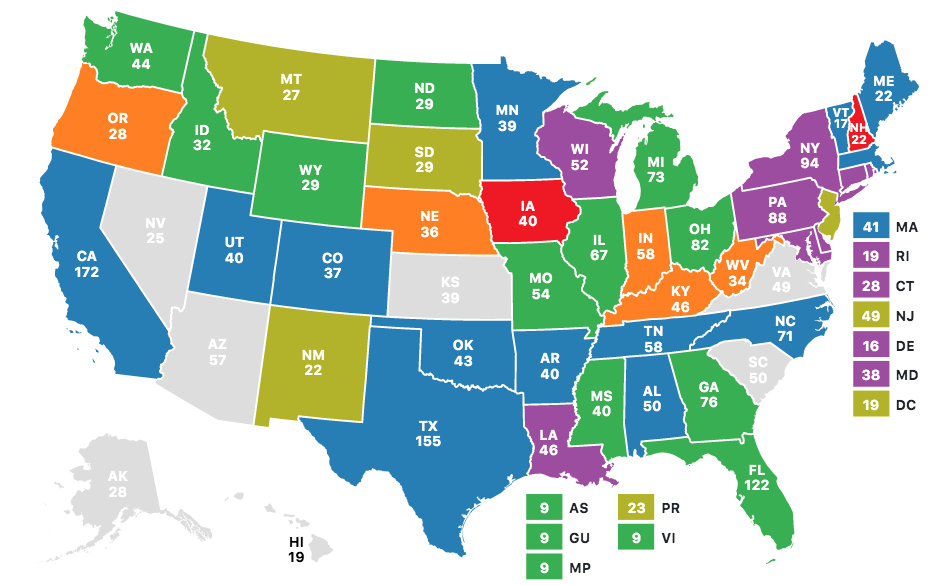 Karte: Anzahl der Delegierten für die demokratischen Vorwahlen pro Bundesstaat. Farbgruppierungen stellen Zeitraum dar, in der die Vorwahl abgehalten wird