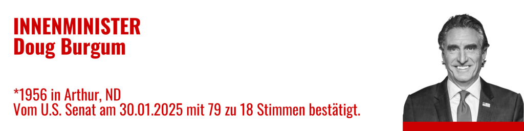 Trump nominierte zwar Vance als seinen Vizepräsidentschaftskandidaten. Doch auf die Dienste von Burgum will der 45. und 47. US-Präsident in seiner zweiten Administration dennoch nicht verzichten. Im Wahlkampf noch als Berater für Energiepolitik zuständig, schließlich setzte sich Burgum als Gouverneur für die weitere Nutzung fossiler Energieträger und für die sogenannte CO2-Sequestrierung (Abscheidung und Speicherung von Kohlenstoffdioxid) ein, nominierte ihn Trump letztendlich als Innenminister. Das Ministerium ist allerdings nicht mit den gleichnamigen Ministerien in Europa vergleichbar, ist es doch nur für die Verwaltung des bundeseigenen Grundvermögens, hierzu gehören beispielsweise Nationalparks, verantwortlich.
