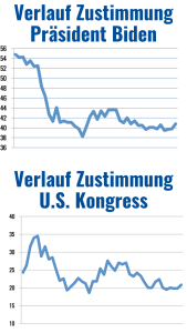 „1600 Pennsylvania“ informiert über die aktuellsten repräsentativen Umfragen rund um US-amerikanische Politik (Pfeil nach oben/unten: Wert ist zum Vormonat gestiegen/hat abgenommen). Quellen, falls nicht anders angegeben, sind die auf Real Clear Politics veröffentlichten Durchschnittswerte der wichtigsten Umfrageinstitute.